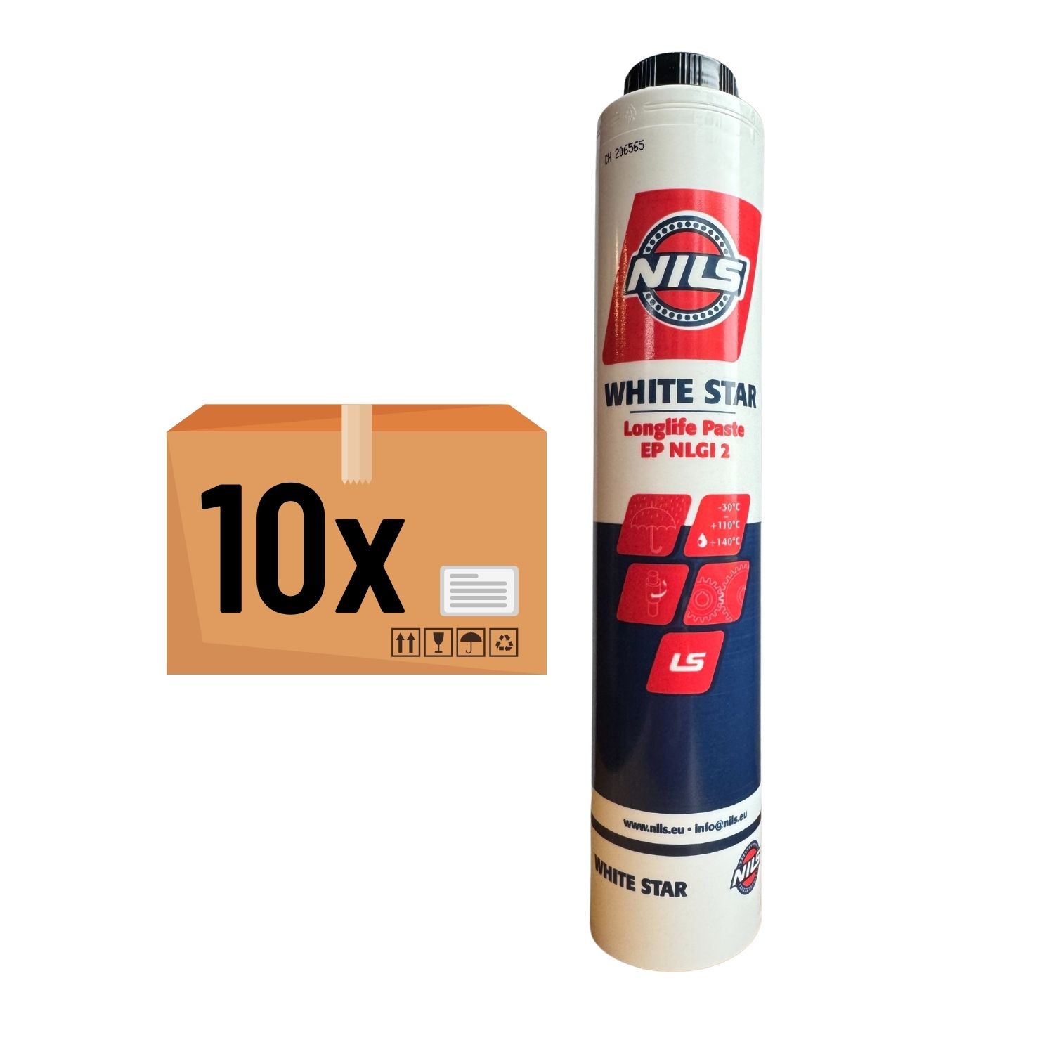 Zestaw 10x NILS White Star – smar nowej generacji, stworzony do długoterminowego smarowania ciężkiego sprzętu budowlanego, takiego jak wolnoobrotowe łożyska, sworznie i koła zębate. Popularny do konserwacji dźwigów i żurawi. Jest wyjątkowo odporny na wypłukiwanie przez wodę z łożysk i ślizgów, zapewniając niezawodną ochronę nawet w warunkach intensywnej wilgoci, wibracji oraz dużych obciążeń. Specjalna formuła, zawierająca specjalne białe dodatki, zapobiega korozji i wydłuża okresy między smarowaniami nawet 4-8 razy w porównaniu ze standardowymi smarami, gwarantując długą żywotność smarowanych elementów.